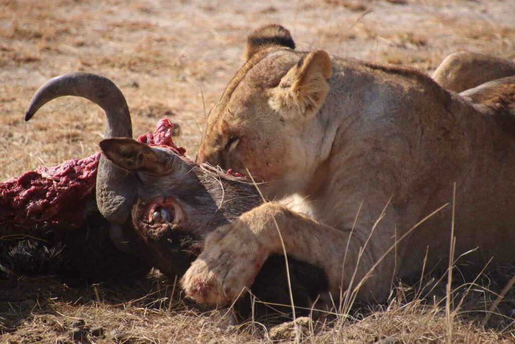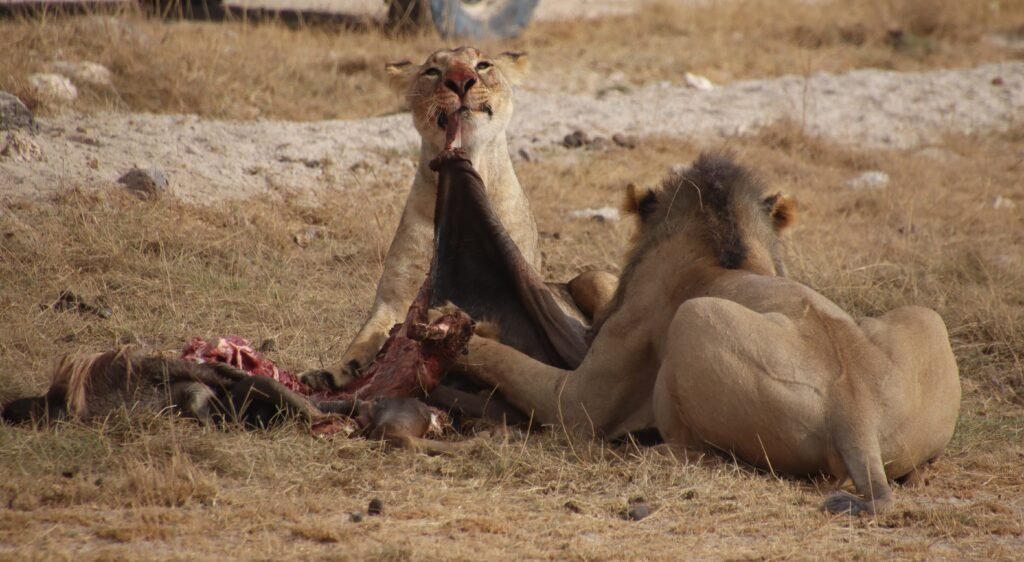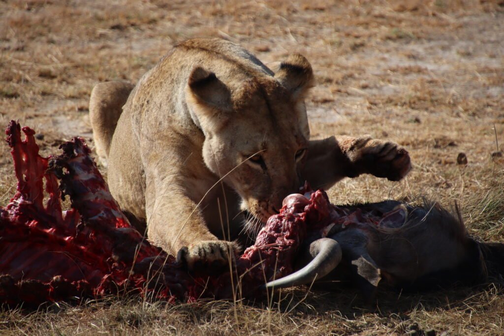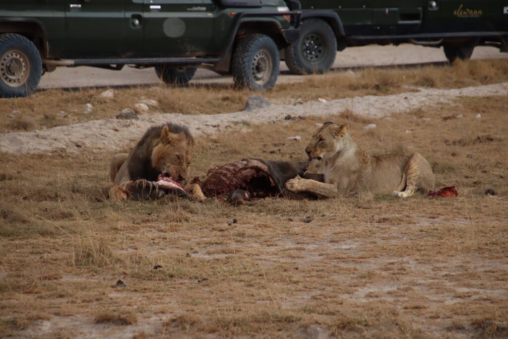 The king walked away, leaving his Mrs. to enjoy the remaining of a rather sumptuous breakfast. The lioness took over and how she relished it! She savoured every bit, devouring the meal with a focus that was both brutal and strangely magnificent to witness from the safety of our seats.