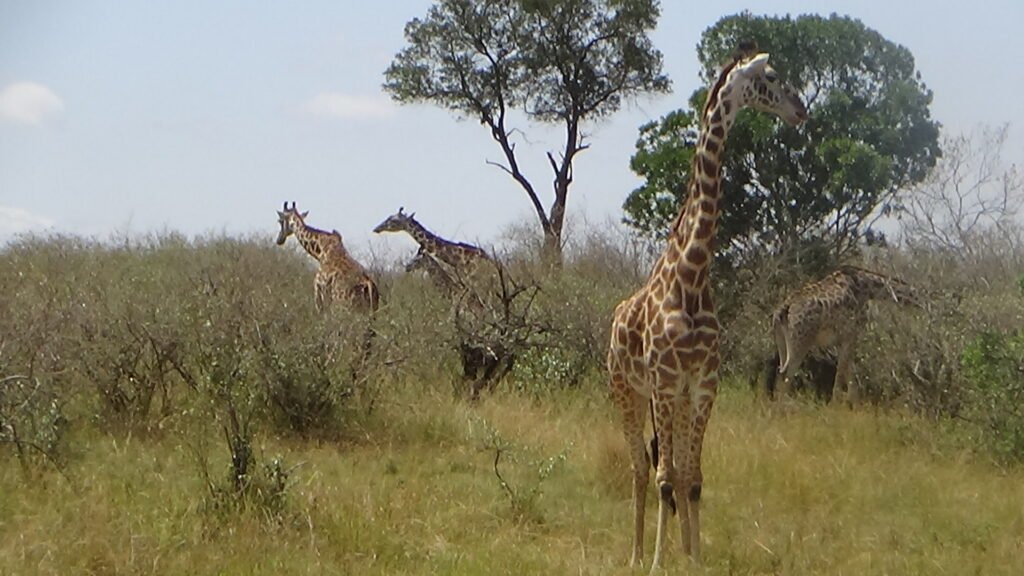 Contrast this with the ‘big prey’ that dot the plains. The Zebra, of course, is the most striking, with those jet-black and brilliant white stripes that seem to melt like a moving maze against the backdrop. It’s a bit of a riot for the senses when a large herd moves together; the stripes blur into a dizzying grey that confuses the eye and, quite fortunately for them, the lions too. Dear friends of the zebras are the wildebeest, sticking close, calm and coy even, with their black grey suit offering the perfect contrast against the stripes of the zebras. The Giraffes, by comparison, are like graceful moving mosaics. Their rich, chestnut patches—divided by lines the colour of cream—echo the jagged patterns of the dry earth beneath their hooves. They stand tall against the clear blue African sky and the golden Acacia, their long necks reaching into the emerald canopy, looking like nothing short of a painting.